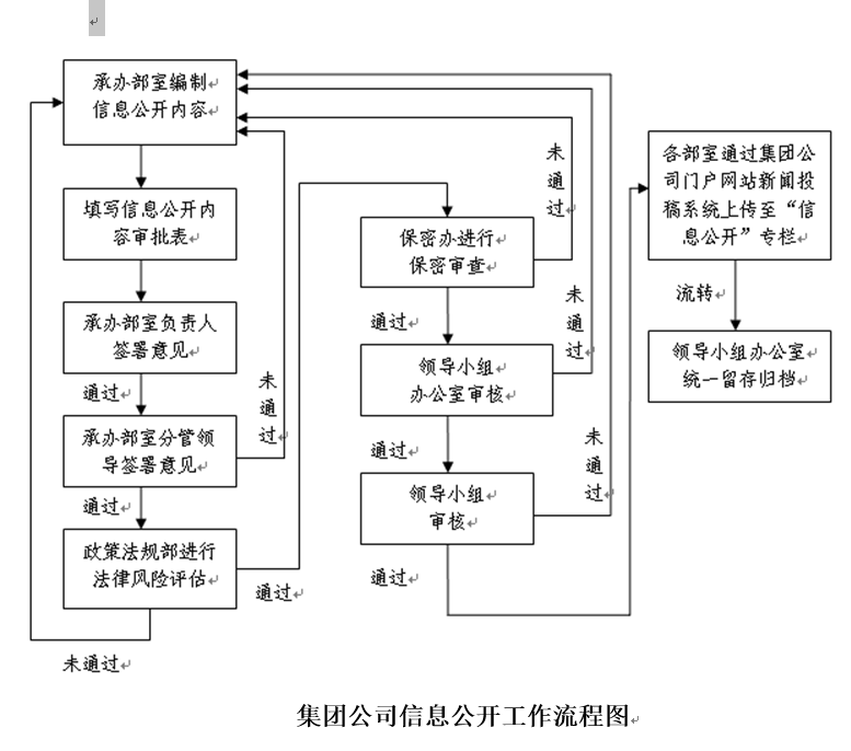 信息內(nèi)容審核。集團(tuán)公司各部室編制完成相關(guān)信息內(nèi)容后,及時填寫《集團(tuán)公司信息公開審批表》(附件),報送政策法規(guī)部進(jìn)行法律風(fēng)險評估,隨后提交保密辦進(jìn)行保密審查,并履行領(lǐng)導(dǎo)小組審核程序。