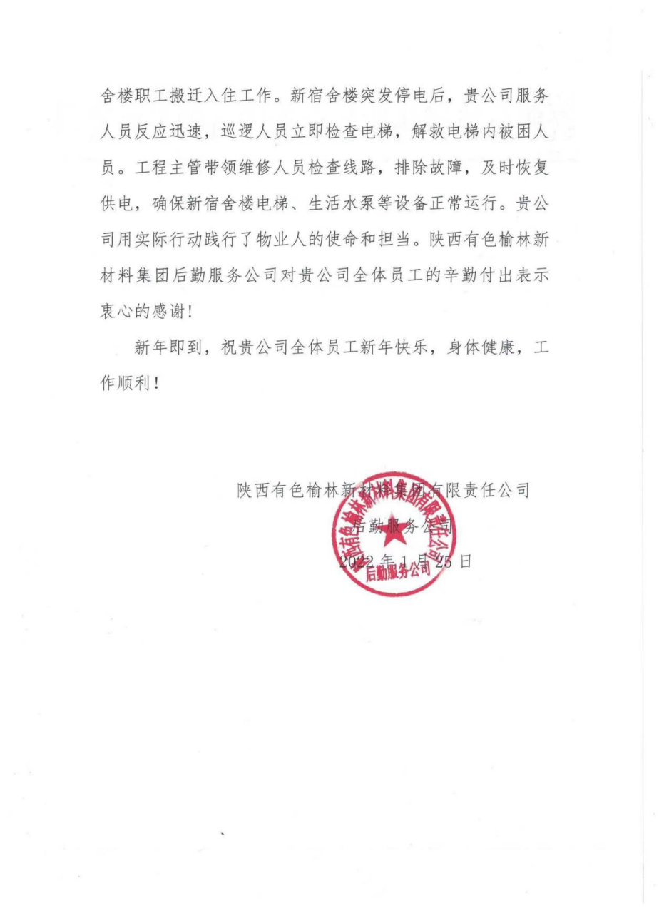 新材料后勤服務(wù)公司的致謝,是對園區(qū)物業(yè)服務(wù)工作的肯定,也是對物業(yè)員工的鼓舞。邁特物業(yè)員工紛紛表示:有付出就有收獲,將更加細(xì)化物業(yè)服務(wù)工作,進(jìn)一步提高服務(wù)品質(zhì),為榆林新材料職工創(chuàng)造舒適、安全、美好的生活環(huán)境。