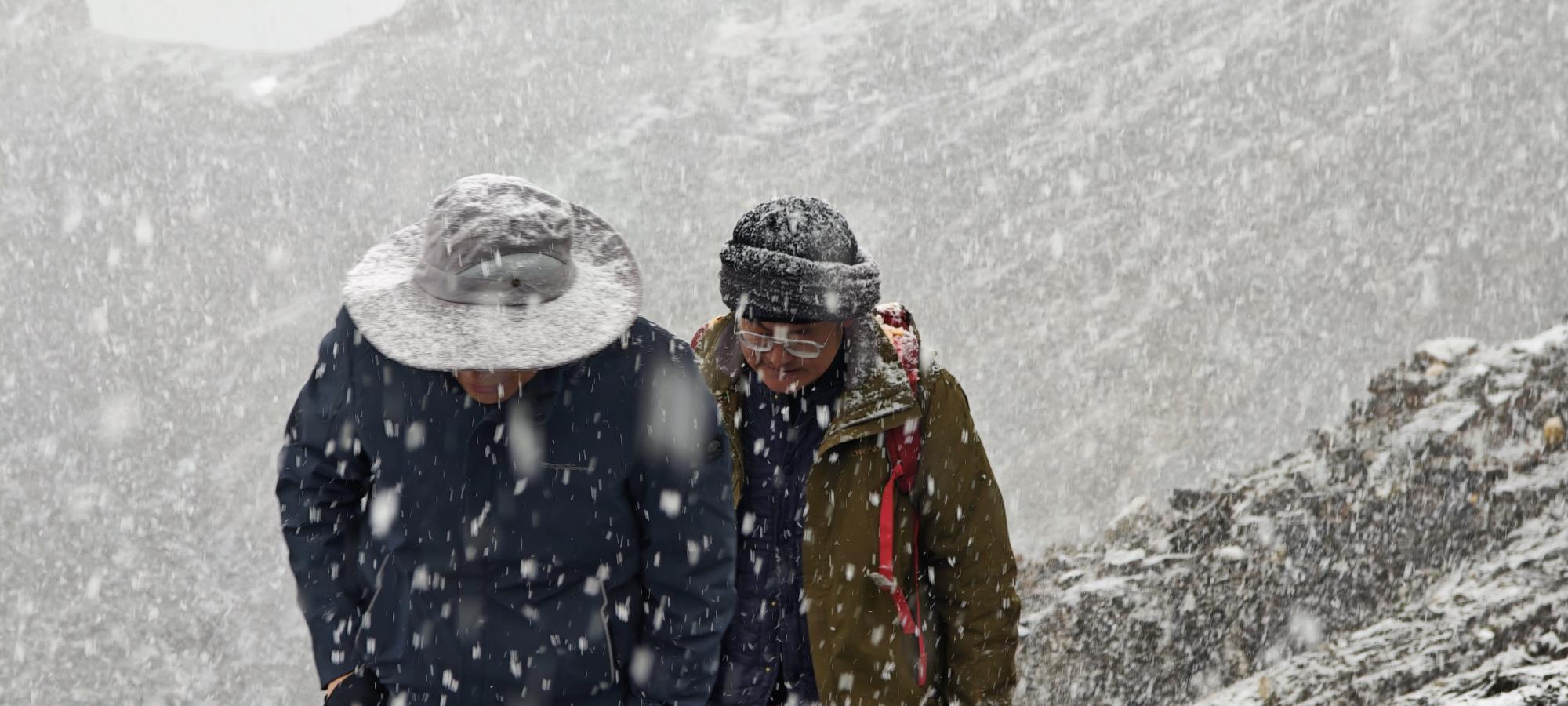 風(fēng)雪是自然最凌厲的筆觸,把地質(zhì)人塑成移動(dòng)的“雪人”。濃霧彌漫處,巖石的棱角在能見度不足五米的混沌里隨時(shí)成了可能傾覆的陷阱。那頂被積雪壓彎的寬檐帽,在雪粒中仍緊盯著巖石的眼鏡,雪窩里深深淺淺不一的足印——每一步都是對(duì)“艱辛”專業(yè)和意志的考驗(yàn)。在海拔3600米的碎石坡上,地質(zhì)錘的敲擊聲被狂風(fēng)撕碎,卻從未停下節(jié)奏;在零下十幾度的嚴(yán)寒里,凍僵的手指仍牢牢攥著羅盤,只為勾勒出地層最真實(shí)的褶皺。