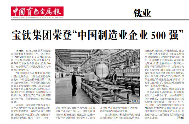 中國(guó)有色金屬報(bào):寶鈦集團(tuán)榮登“中國(guó)制造業(yè)企業(yè)500強(qiáng)”
