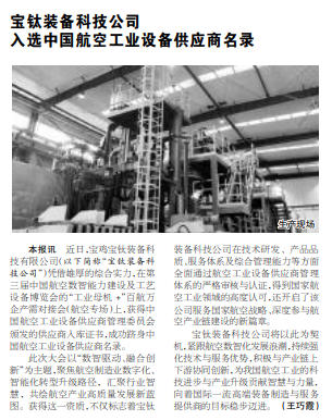 近日,寶雞寶鈦裝備科技有限公司(以下簡稱“寶鈦裝備科技公司”)憑借雄厚的綜合實力,在第三屆中國航空數(shù)智能力建設(shè)及工藝設(shè)備博覽會的“工業(yè)母機+”百航萬企產(chǎn)需對接會(航空專場)上,獲得中國航空工業(yè)設(shè)備供應(yīng)商管理委員會頒發(fā)的供應(yīng)商入庫證書,成功躋身中國航空工業(yè)設(shè)備供應(yīng)商名錄。