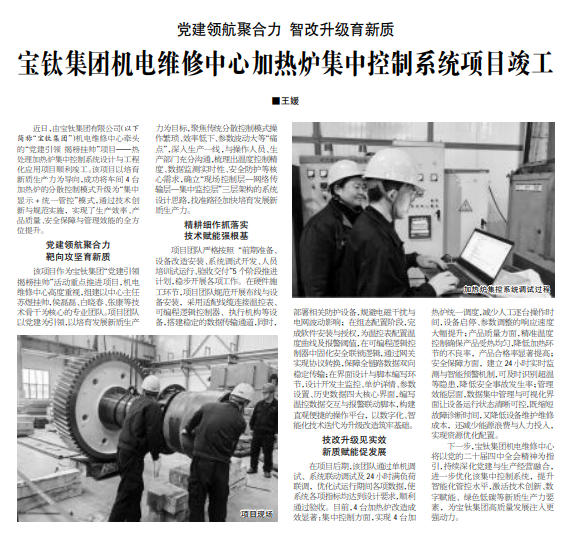 近日,由寶鈦集團有限公司(以下簡稱“寶鈦集團”)機電維修中心牽頭的“黨建引領 揭榜掛帥”項目——熱處理加熱爐集中控制系統(tǒng)設計與工程化應用項目順利竣工。該項目以培育新質(zhì)生產(chǎn)力為導向,成功將車間4臺加熱爐的分散控制模式升級為“集中顯示+統(tǒng)一管控”模式,通過技術創(chuàng)新與規(guī)范實施,實現(xiàn)了生產(chǎn)效率、產(chǎn)品質(zhì)量、安全保障與管理效能的全方位提升。