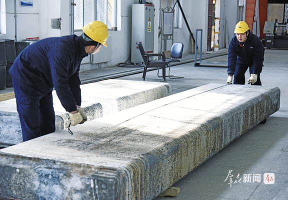 (工人在測(cè)量單重4.6噸的鎂合金鑄錠尺寸)