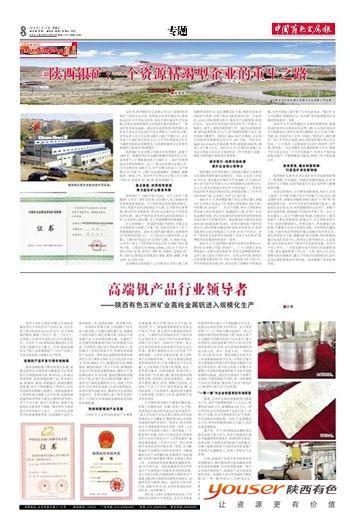 中國(guó)有色金屬報(bào):高端釩產(chǎn)品行業(yè)領(lǐng)導(dǎo)者——陜西有色五洲礦業(yè)高純金屬釩進(jìn)入規(guī)?;a(chǎn)