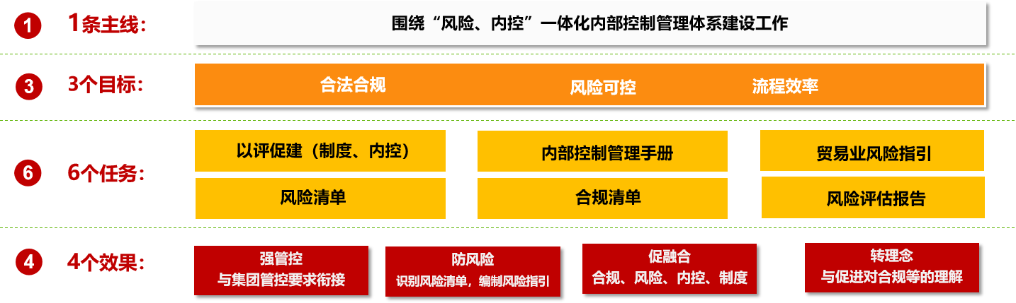 高標(biāo)準(zhǔn)規(guī)劃:緊扣“風(fēng)險(xiǎn)、內(nèi)控一體化建設(shè)”這一主線,按照“1364”思路系統(tǒng)推進(jìn)——錨定合法合規(guī)、風(fēng)險(xiǎn)可控、管控高效三大目標(biāo),一體完成內(nèi)控診斷報(bào)告、風(fēng)險(xiǎn)清單、合規(guī)清單、風(fēng)險(xiǎn)評(píng)估報(bào)告、內(nèi)部控制手冊(cè)、貿(mào)易業(yè)務(wù)風(fēng)險(xiǎn)指引六項(xiàng)任務(wù),全面達(dá)成強(qiáng)管控、防風(fēng)險(xiǎn)、促合規(guī)、轉(zhuǎn)理念四項(xiàng)成效,為企業(yè)高質(zhì)量發(fā)展筑牢堅(jiān)實(shí)屏障。