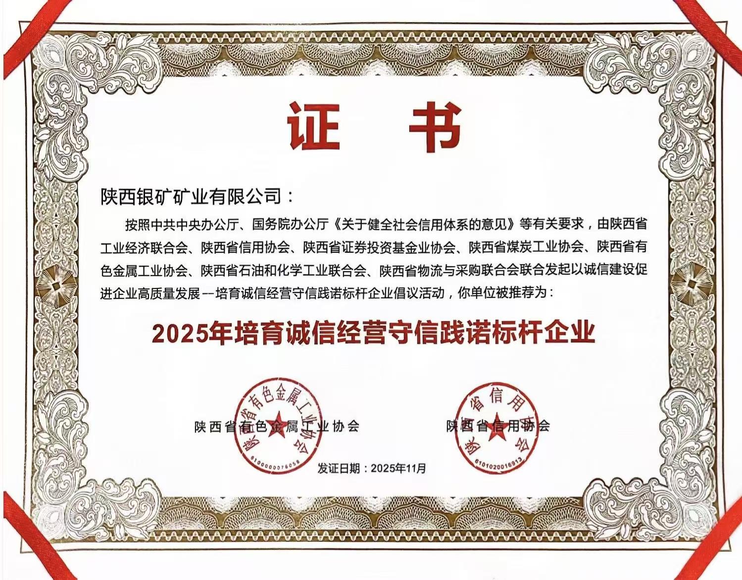 近日,陜西銀礦礦業(yè)有限公司被陜西省有色金屬工業(yè)協(xié)會與陜西省信用協(xié)會聯(lián)合評為“2025年培育誠信經(jīng)營守信踐諾標(biāo)桿企業(yè)”。這一榮譽標(biāo)志著陜西銀礦在誠信體系建設(shè)領(lǐng)域的成果獲得行業(yè)與信用管理權(quán)威機構(gòu)的雙重認(rèn)可。