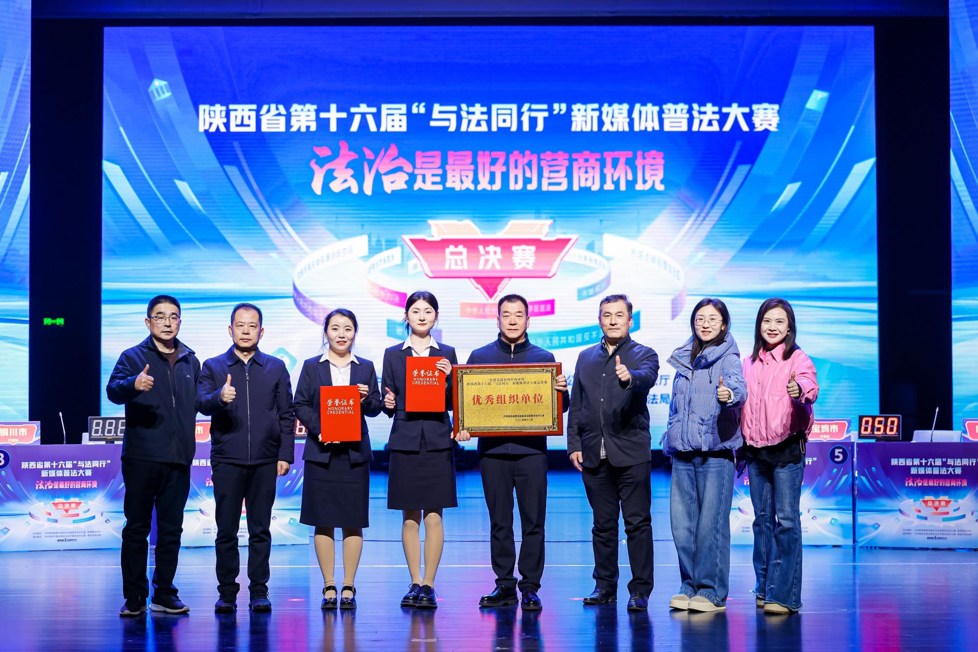 12月3日,陜西省第十六屆“與法同行”新媒體普法大賽總決賽在商洛市圓滿落幕,來自全省各地市及楊凌示范區(qū)的11支代表隊展開巔峰對決。代表寶雞市參賽的四方金礦選手高怡君、劉萍,憑借扎實的法律功底、默契配合與出色的臨場發(fā)揮,一路過關(guān)斬將,勇奪大賽總冠軍。