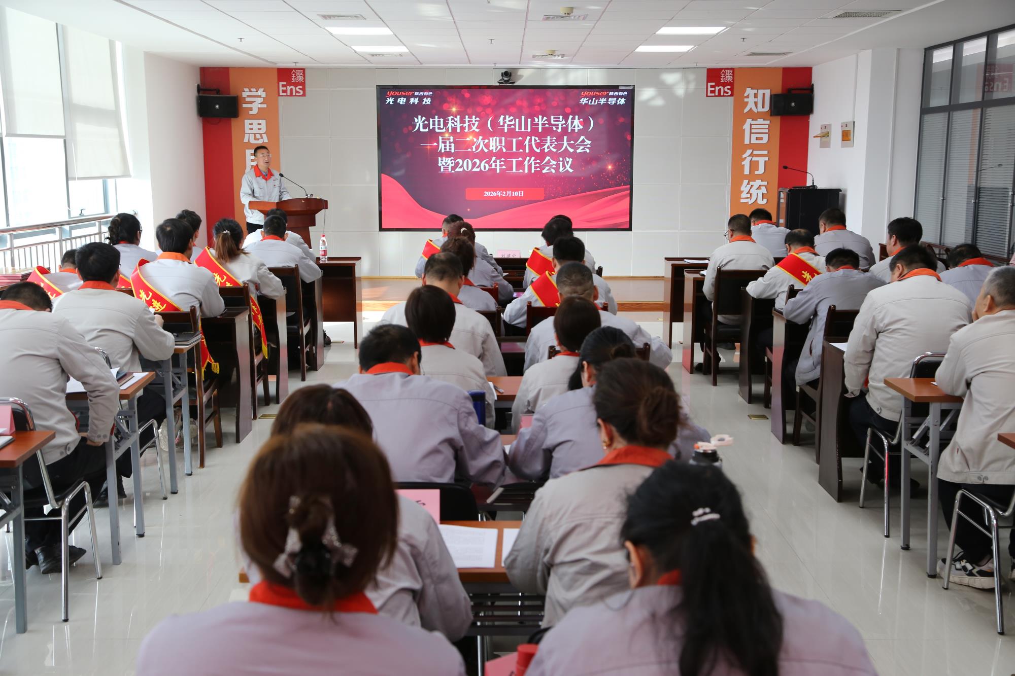 2月10日,光電科技(華山半導(dǎo)體)召開一屆二次職工代表大會(huì)暨2026年工作會(huì)議。會(huì)議深入貫徹落實(shí)集團(tuán)公司三屆四次職代會(huì)暨2026年工作會(huì)議精神,全面總結(jié)2025年及“十四五”發(fā)展成效,科學(xué)謀劃“十五五”發(fā)展藍(lán)圖,系統(tǒng)部署2026年重點(diǎn)任務(wù),動(dòng)員全體干部職工以實(shí)干擔(dān)當(dāng),奮力譜寫高質(zhì)量發(fā)展提質(zhì)見效新篇章。公司黨委書記、董事長(zhǎng)劉建中出席會(huì)議并講話。公司領(lǐng)導(dǎo)班子成員,職工代表、列席代表,以及受表彰的先進(jìn)集體代表和先進(jìn)個(gè)人參加會(huì)議,工會(huì)主席鄭興貴主持會(huì)議。