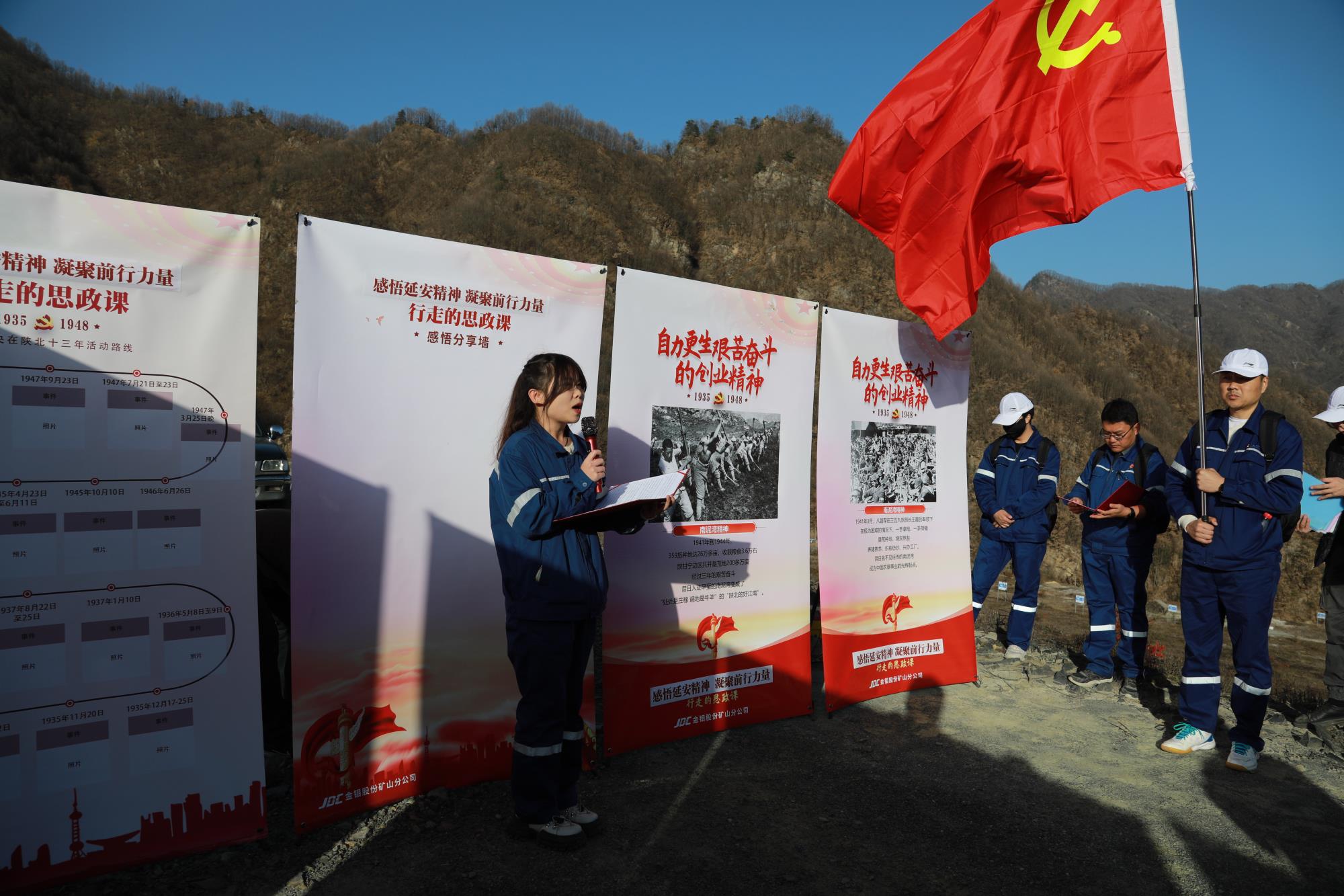 為確保思政課取得實實在在成效,金鉬集團礦山分公司黨委提前籌劃,精心準備,在總長約6公里的木子溝尾礦庫沿途,設(shè)置4個集合點,放置“堅定正確的政治方向、解放思想實事求是的思想路線、全心全意為人民服務(wù)的根本宗旨、自力更生艱苦奮斗的創(chuàng)業(yè)精神”四塊紅色展板,通過場景模擬、現(xiàn)場講述等方式,系統(tǒng)回顧在百年黨史中熠熠生輝的延安精神,滋養(yǎng)初心、淬煉靈魂。