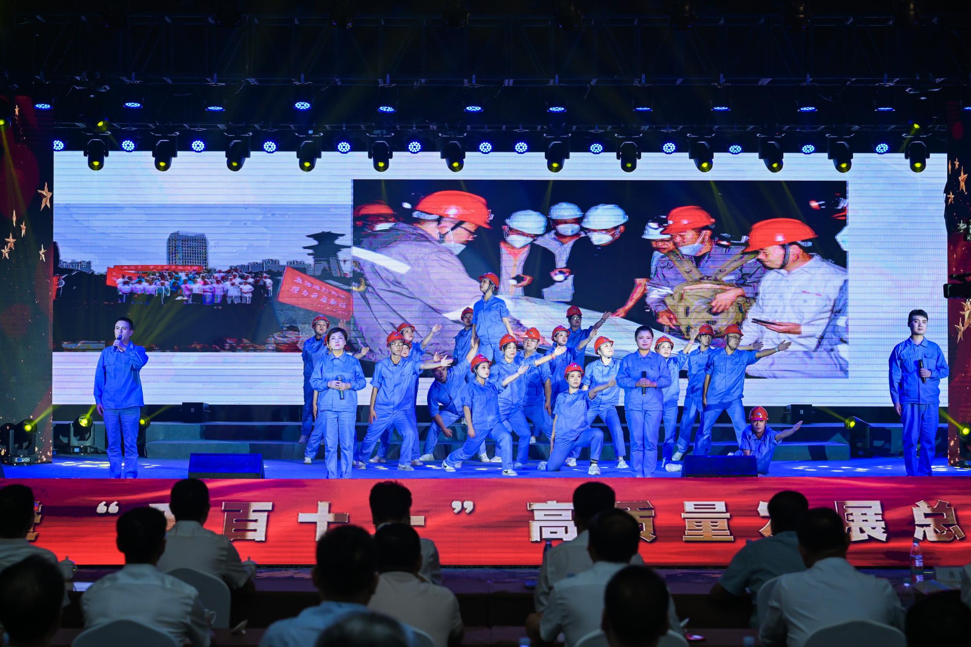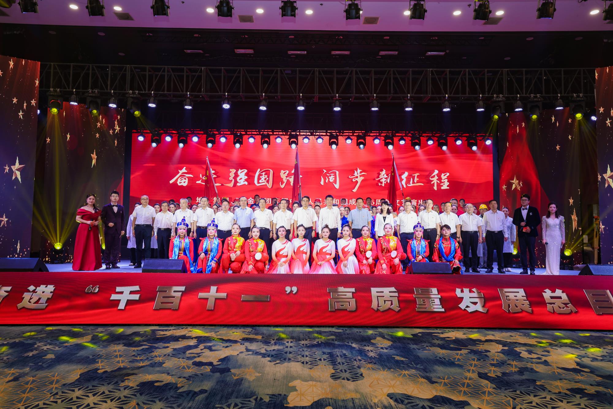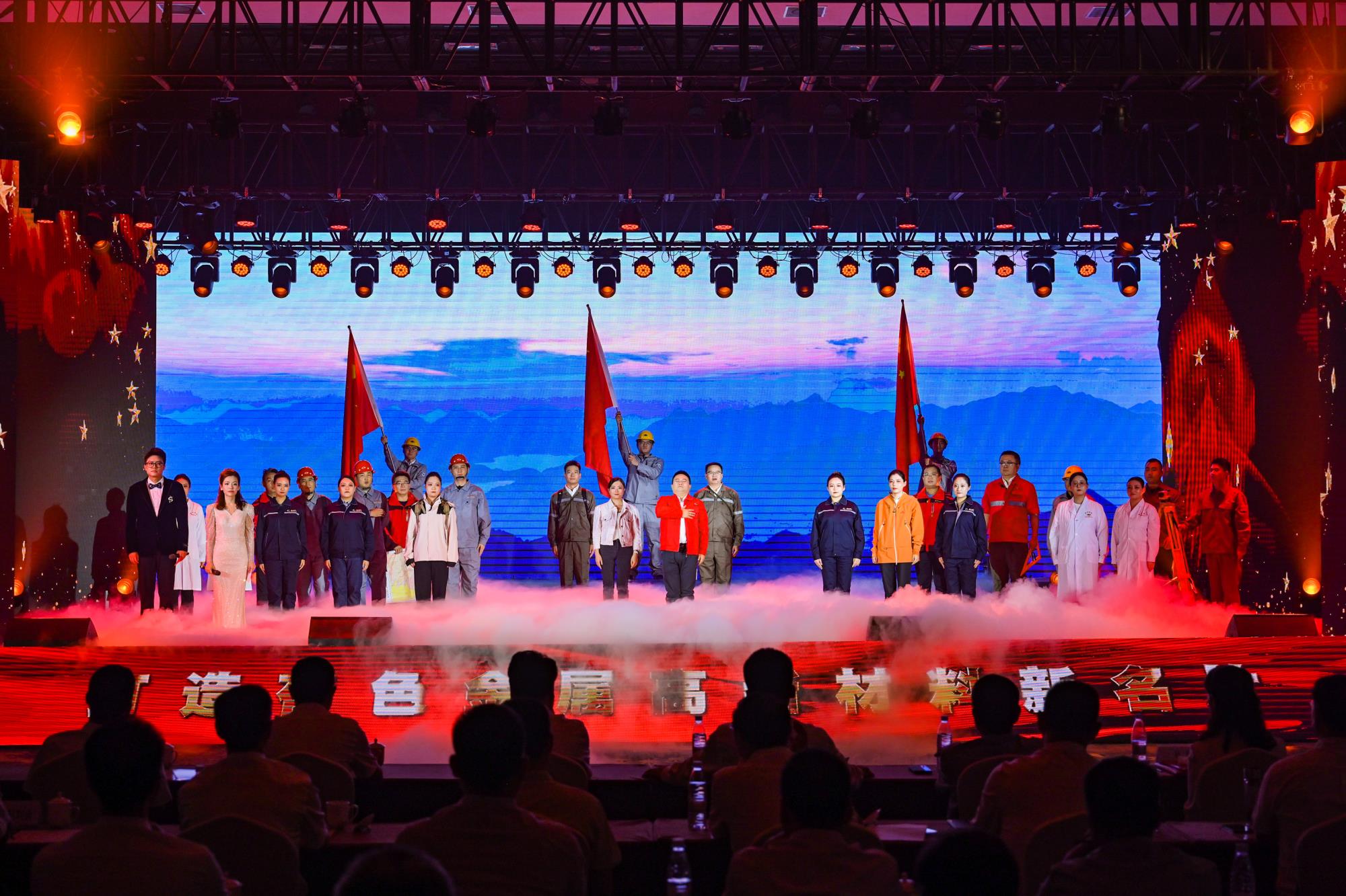 “我們都是奮斗者,報國夙愿挺身償。勇立潮頭搏浪去,萬眾攻堅鑄輝煌。肩擔(dān)著使命創(chuàng)偉業(yè),復(fù)興路上圓夢想!”一首首動人的歌曲,一段段優(yōu)美的舞蹈,一句句深情的朗誦,傳遞著對偉大祖國的無限祝福,對有色事業(yè)的執(zhí)著熱愛,對美好生活的熾熱向往,凝聚起廣大職工為實現(xiàn)中國夢、強企夢而不懈奮斗的壯志豪情。以磐石之志,堅地質(zhì)初心,廣大職工表示將立足本職、擔(dān)當(dāng)作為,為實現(xiàn)兩集團高質(zhì)量跨越發(fā)展,奮進(jìn)陜西有色金屬集團“千百十一”總目標(biāo)再創(chuàng)佳績、再立新功。兩集團領(lǐng)導(dǎo)班子成員、部分外部董事,機關(guān)全體人員,權(quán)屬單位主要負(fù)責(zé)人、工會主席、受表彰代表和職工代表等300余人在現(xiàn)場觀看演出。本次活動通過新媒體平臺進(jìn)行了圖片直播,截至發(fā)稿前,累計吸引12萬余人次線上觀看。