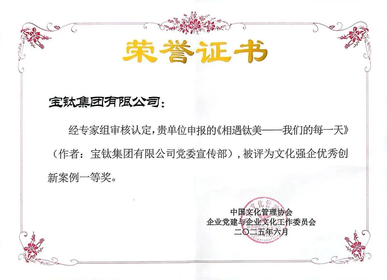 近日,由寶鈦集團(tuán)黨委宣傳部、文化新聞中心創(chuàng)作的微紀(jì)錄片《相遇鈦美——我們的每一天》,被中國文化管理協(xié)會(huì)企業(yè)黨建與企業(yè)文化工作委員會(huì)評(píng)為文化強(qiáng)企優(yōu)秀創(chuàng)新案例一等獎(jiǎng)。這一榮譽(yù)的獲得,不僅是對(duì)該微紀(jì)錄片藝術(shù)價(jià)值和文化內(nèi)涵的高度認(rèn)可,更是寶鈦集團(tuán)企業(yè)文化建設(shè)工作成效的有力證明。