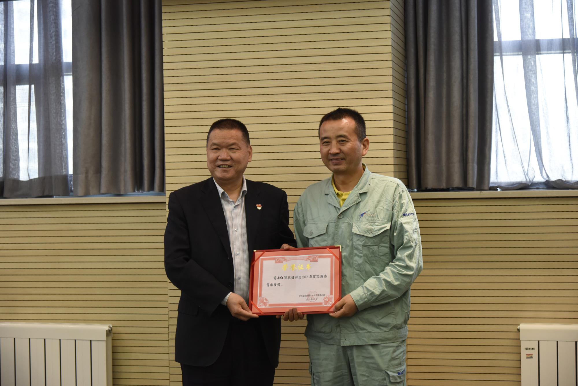 會(huì)上,王建超還為榮獲2021年度寶雞市首席技師的肖小紅和寶雞市技術(shù)能手的張平頒發(fā)了榮譽(yù)證書。