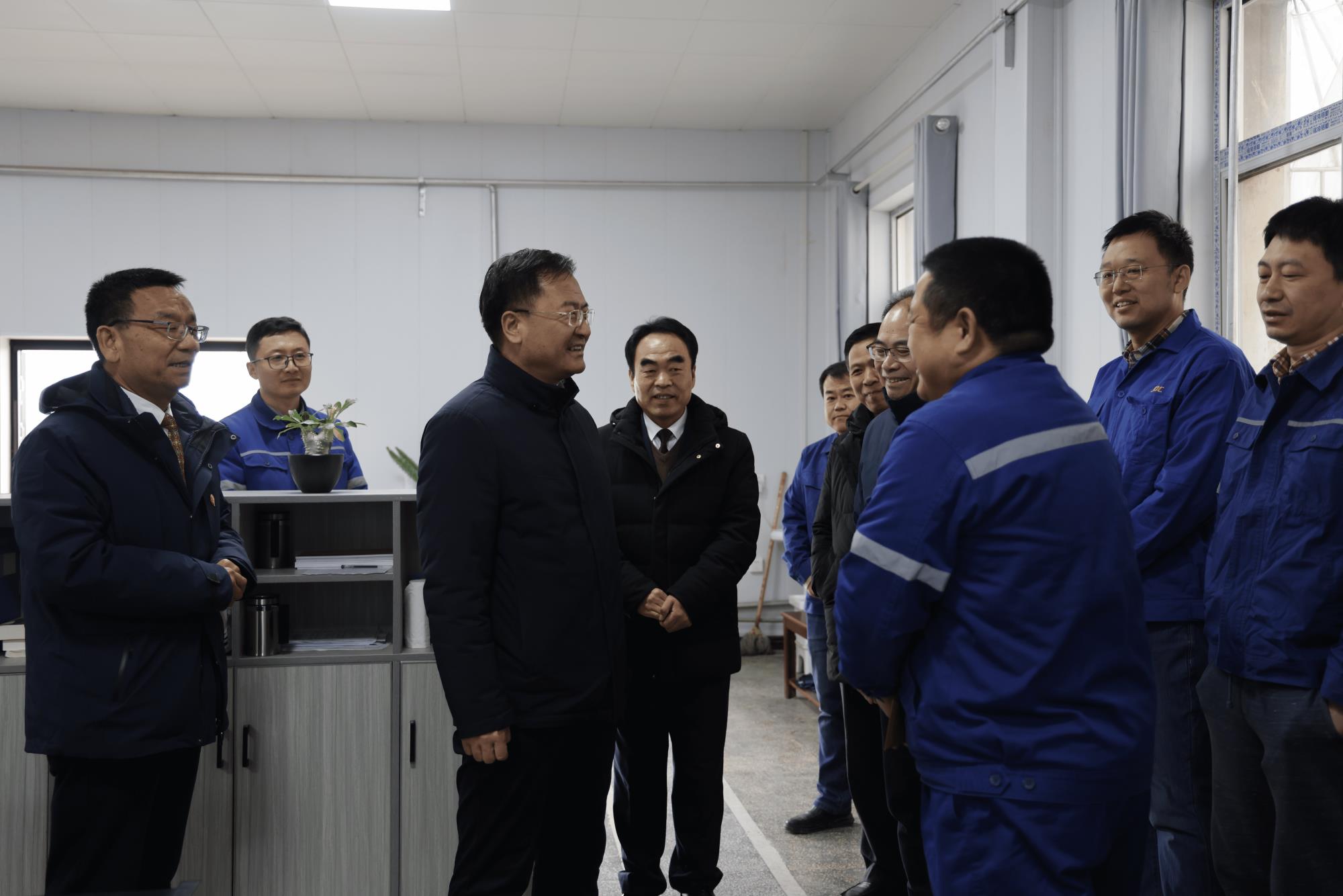 在王國順當班的一區(qū)值班室,嚴平聽取了采場生產工藝以及調度室人員值班等情況介紹,對王國順多年來扎根一線、默默奉獻的精神表示感謝,勉勵他要繼續(xù)發(fā)揮先鋒模范作用,帶領團隊為推動公司高質量發(fā)展貢獻智慧和力量。