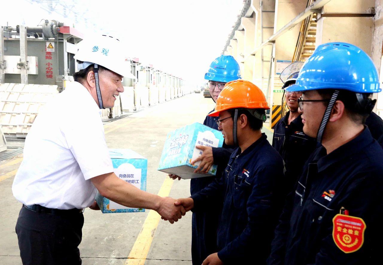 樊樹(shù)森一行深入鋁業(yè)分公司電解一車間,實(shí)地察看產(chǎn)業(yè)工人的工作環(huán)境,親切慰問(wèn)一線高溫崗位上的職工,為他們送上防暑降溫物品,叮囑大家注意防暑降溫,強(qiáng)化安全意識(shí),確保安全生產(chǎn)。