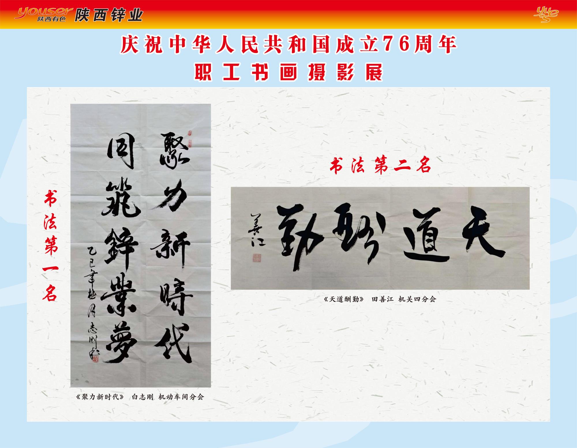 書(shū)法類(lèi):一等獎(jiǎng)機(jī)動(dòng)車(chē)間分會(huì)《聚力新時(shí)代》;二等獎(jiǎng)機(jī)關(guān)四分會(huì)《天道酬勤》;三等獎(jiǎng)鋅粉車(chē)間分會(huì)《勞動(dòng)最光榮》。