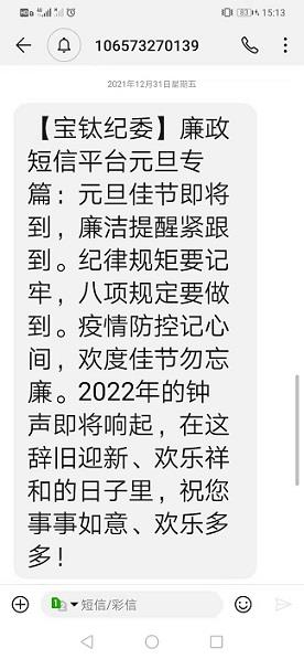 節(jié)前,寶鈦集團紀委在寶鈦啟明星微信公眾號、寶鈦OA協同網廉政教育專欄刊載中央紀委國家監(jiān)委公開通報十起違反中央八項規(guī)定精神典型問題和陜西省紀委監(jiān)委公開通報五起違反中央八項規(guī)定精神典型問題;通過廉政短信平臺,元旦前夕向公司所有中層及以上干部發(fā)送廉政短信1條,共計225人次,要求公司廣大黨員領導干部要落實好廉潔過節(jié)的各項紀律要求,筑牢思想防線,努力營造風清氣正的過節(jié)氛圍。