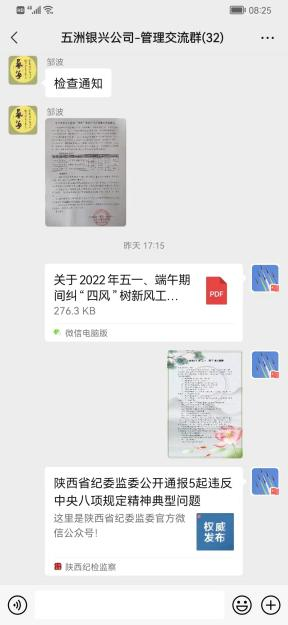節(jié)中有檢查。4月30日,公司紀(jì)委副書記劉行前往柞水縣金米溝,對銀礦本部進行了突擊檢查,主要對留守值班、疫情防控、安全生產(chǎn)、車輛封存等情況作了檢查,對發(fā)現(xiàn)的問題即時反饋,要求立行立改、即知即改,及時完善各項工作措施,積極應(yīng)對突發(fā)事件,確保公司糾治“四風(fēng)”工作持續(xù)向好;公司紀(jì)委緊盯節(jié)日期間易發(fā)多發(fā)問題,圍繞違規(guī)收送禮品禮金、違規(guī)吃喝、違規(guī)使用公務(wù)用車等重點問題,針對費用報銷情況展開專項檢查并與財務(wù)部負(fù)責(zé)人進行交流,要求對存在的問題和漏洞及時進行修改和完善;全體紀(jì)檢員主動作為,對照基層單位實際生產(chǎn)情況,分別組織開展了節(jié)日期間糾治“四風(fēng)”監(jiān)督檢查。