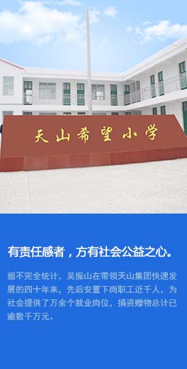 天山集團始終自覺履行社會責任、感恩回報社會,在參與社會主義新農村建設、希望工程、城市建設等公益光彩事業(yè)上做出了諸多貢獻。